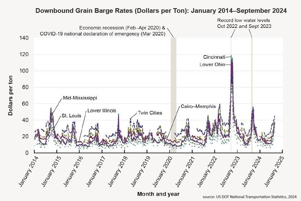 Thus, spot market barging freight rates in Spring 2025 were consistent with seasonal levels from recent years.