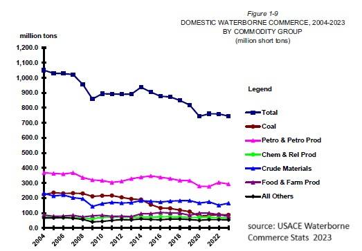 The latest available data from the U.S. Army Corps of Engineers (USACE) shows that the “internal portion” of U.S. waterborne commerce decreased from 622 million st in 2007, to 449 million st during 2023.