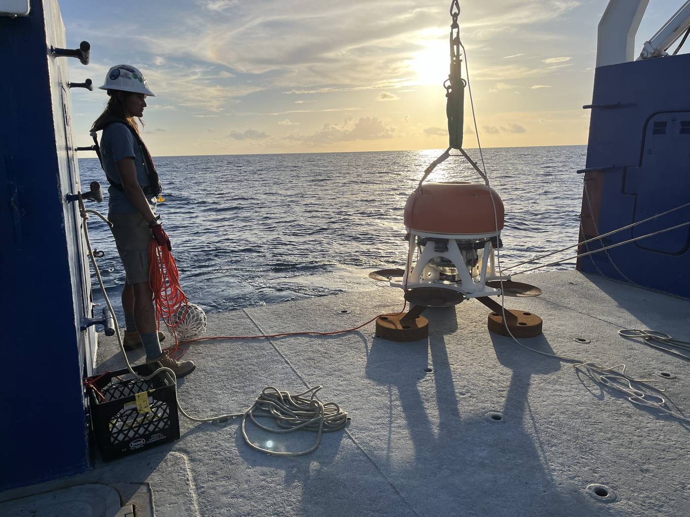 A TRW Antenna of seabed instrumentation was deployed by URI in 2024, including seven Pressure Inverted Echo Sounders (PIESs) and four Sonardyne Origin 65 Acoustic Doppler Current Profilers (ADCPs), which integrate PIES and acoustic modem technology with a 65 kHz ADCP. The array was deployed east of the Sigsbee Escarpment to allow the TRWs to be monitored as they propagated through the mooring locations toward the escarpment where they intensify.
