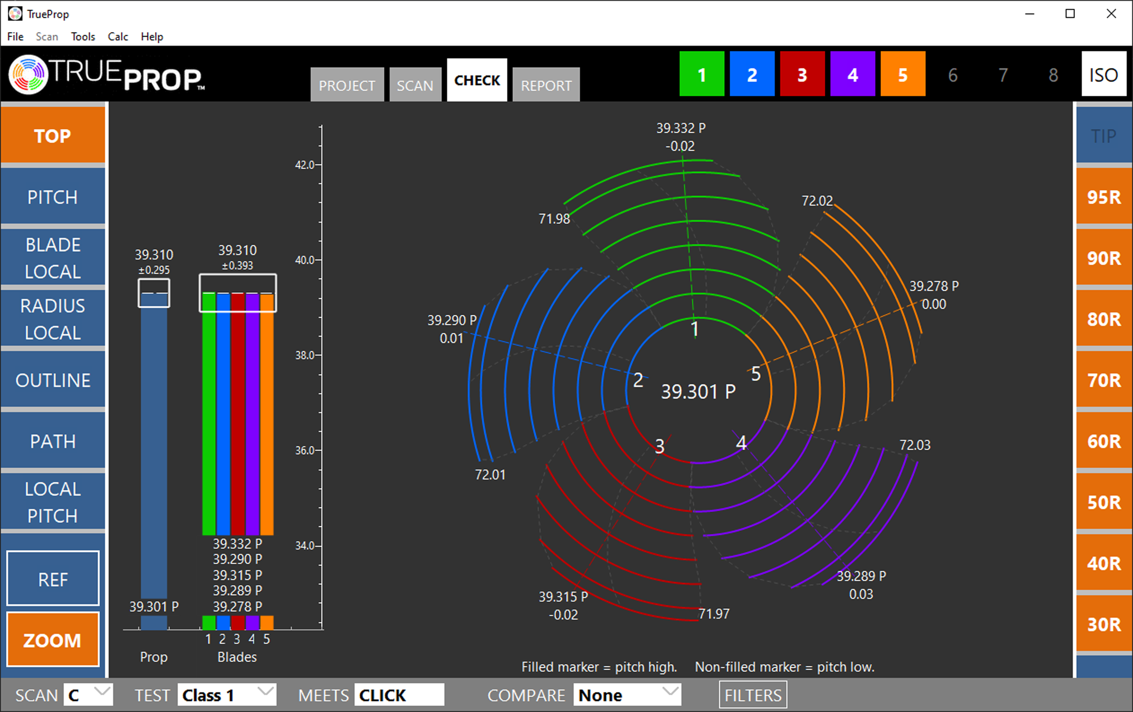 At its core, TrueProp is measurement software. In the traditional configuration, it connects to mechanical “drop rod” pitchometers, devices that measure blade radius, drop, and angle at set positions. With TrueProp Virtual, the data source shifts to 3D scanners. Kaplan’s team has curated scanner packages optimized for maritime conditions: