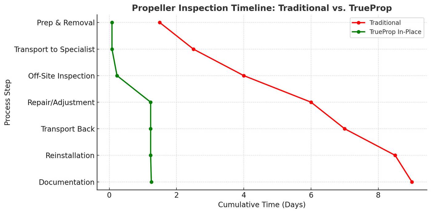 Traditional method: Remove the propeller, transport to a specialist, inspect, repair, transport back, re-install—often a 10-day process.