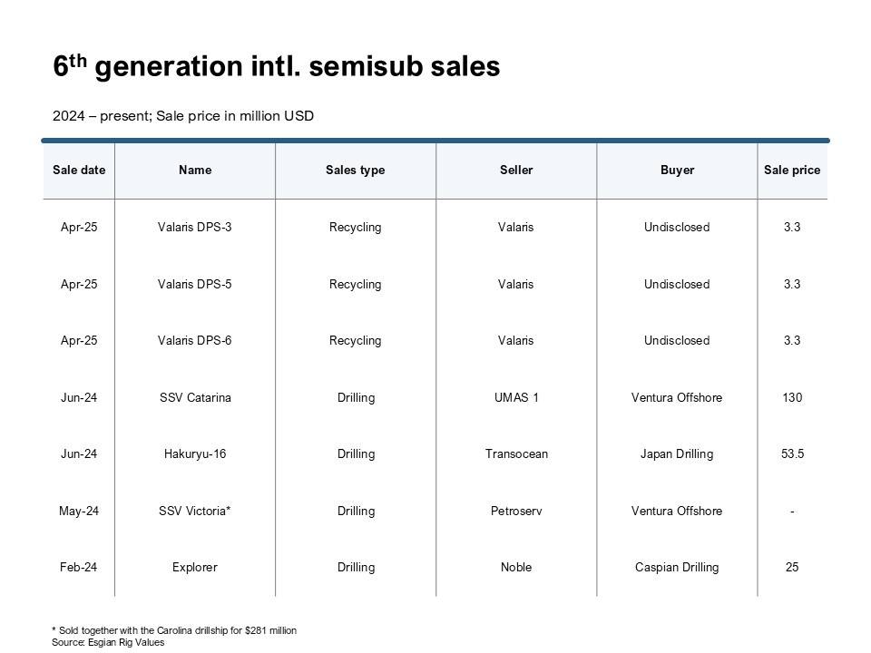Three sixth-gen international semi-subs were sold for recycling this year, a trend likely to continue. Additionally, four rigs have been sold for drilling purposes since early 2024, highlighting the shrinking resale market.