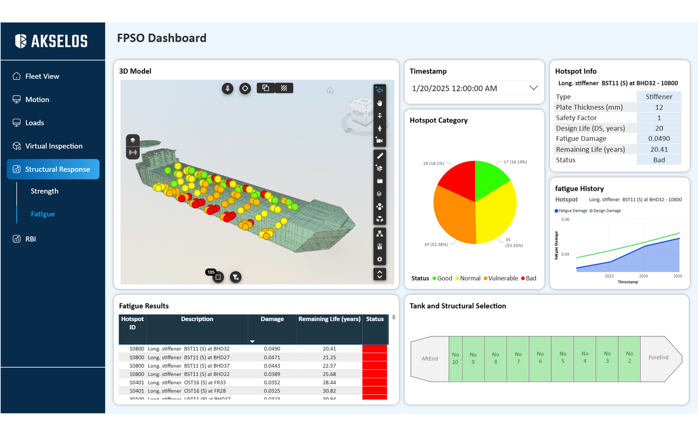 Akselos’ SPM software is also being used for life-extension analysis. The system changes the scale of sensor and strain gauge monitoring by providing a high-fidelity, near real-time structural twin of an entire FPSO. This has been made possible by a new, faster patented RB-FEA calculation method the company developed. By combining inspection records, metocean conditions, and cargo operations into one dynamic model, operators gain a live, continuous view of structural performance. This allows for real-time monitoring, identification of stress concentrations, and on-demand fatigue analysis to support data-driven maintenance and risk-based inspections.
